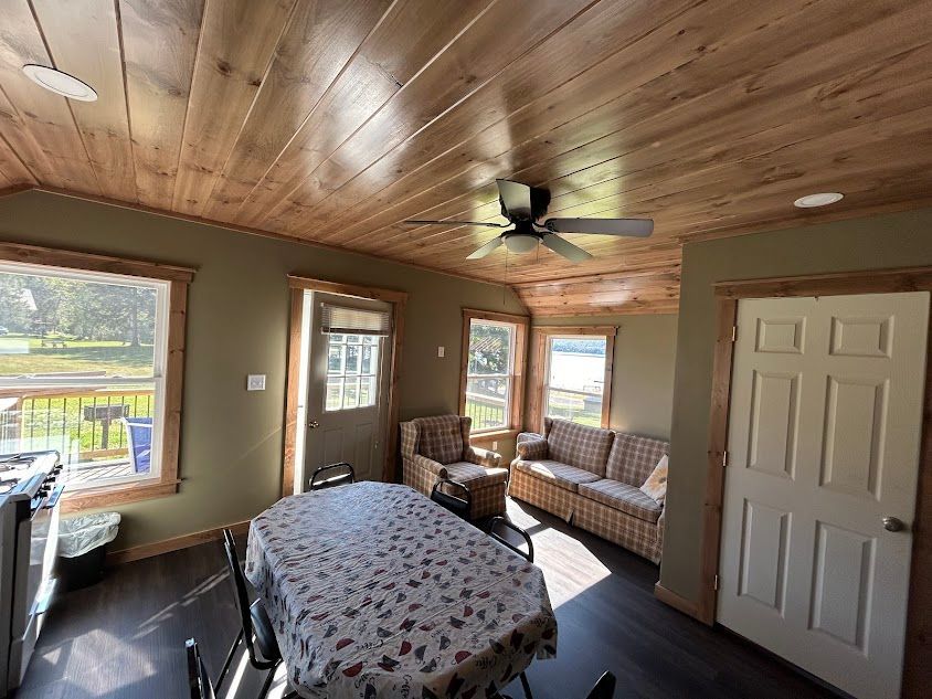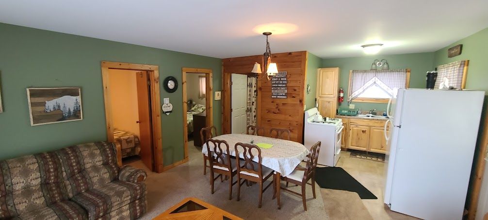 Your Adirondack getaway awaits in Eagle Bay at 1 of our cozy cabins. Nestled in a peaceful lakefront setting, our cabins offer a picturesque view overlooking 4th lake. With 2 bedrooms consisting of 1 queen bedroom, and one with 2 double size beds. The full bathroom equipped with all the essentials. The dining room features seating for 6. The kitchen has full size appliances stocked with all the essentials. As guests of Eagle Bay Village, you will have access to the sandy beach with a designated swimming area, as well as the family friendly playground equipment. Guests will also have freedom to explore the 11 acre property. Boat slips are available to rent during your stay.