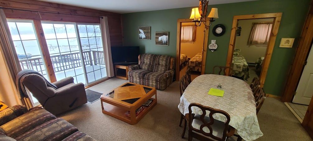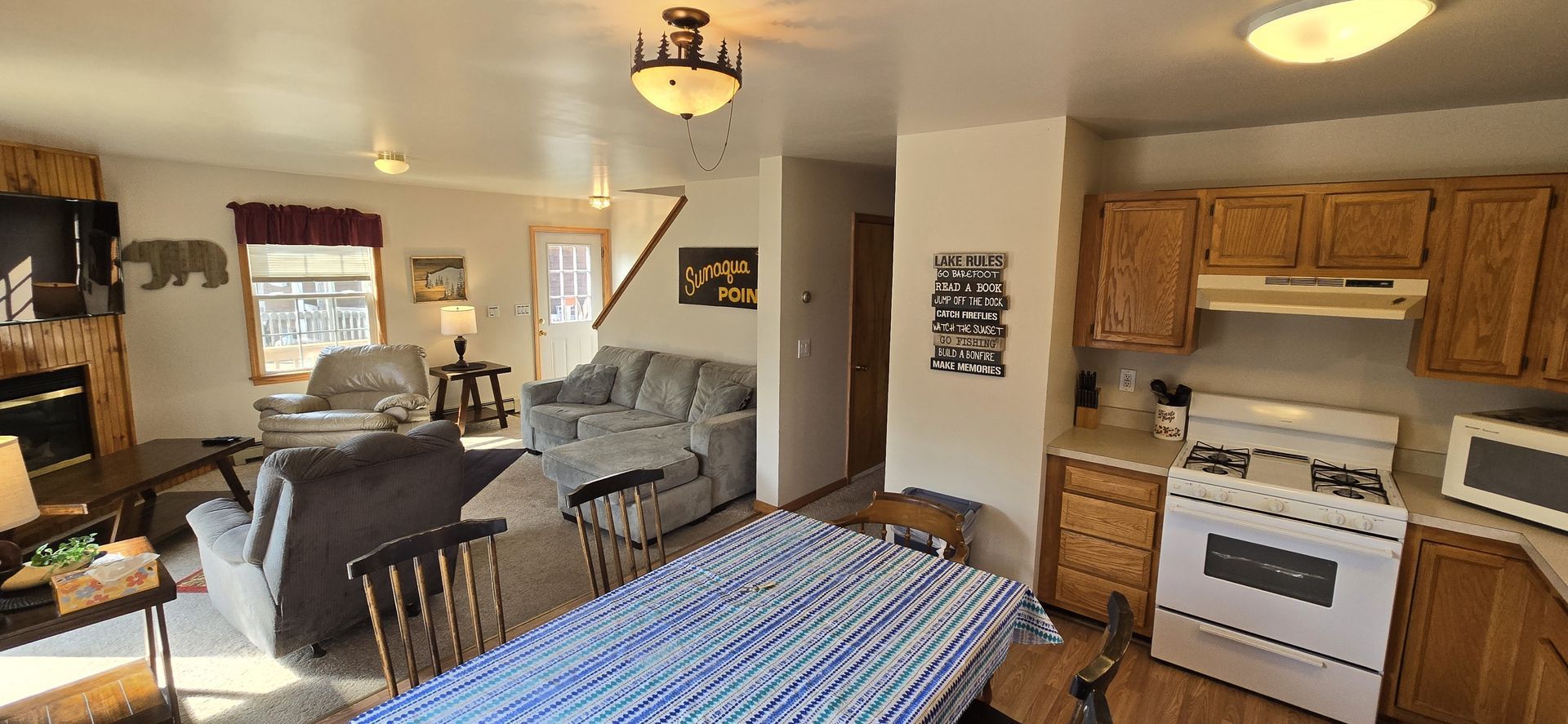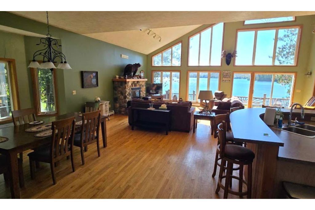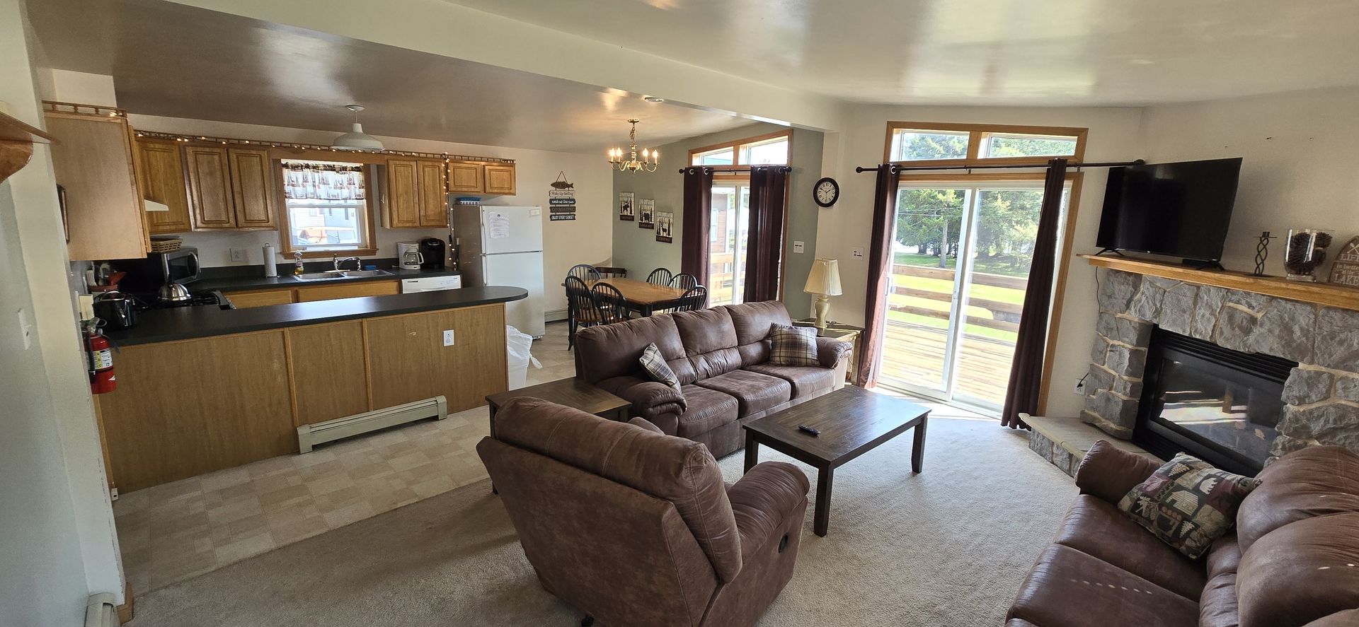 The main living space features an open-concept layout with a cozy gas fireplace, large dining table, and fully equipped kitchen. Step out onto the private deck and take in views of 4th Lake, or enjoy your morning coffee in the screened-in porch.